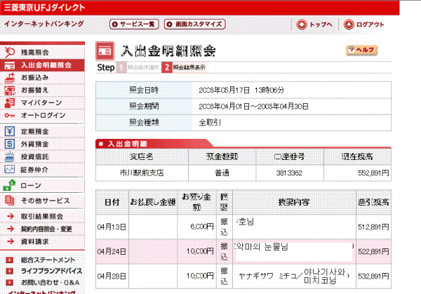 4월28일 입금 야나기사와 미치코님 10,000엔