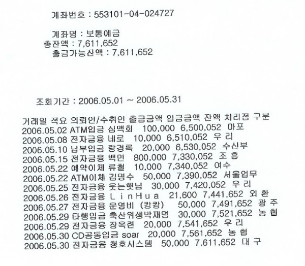 청호님 .................... 50,000 원 총 잔액 ......... 7,611,652 원