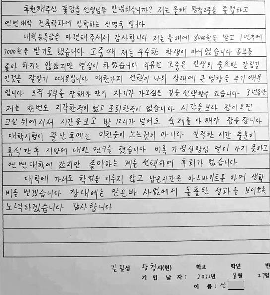 이에 신**학생의 감사편지로 장학금 지급 확인서를 대신하고자 합니다. 감사편지를 사진으로 첨부해 드립니다.